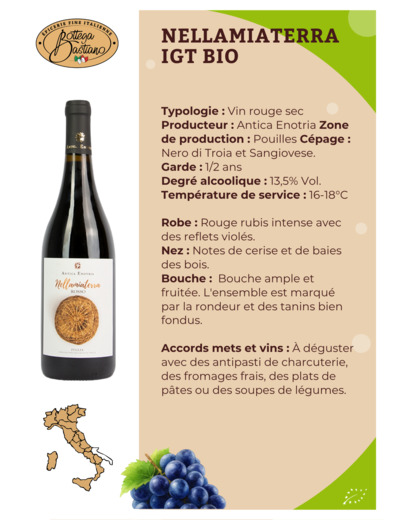 Vin rouge sec, issu de l'Agriculture Biologique. A associer à des antipasti de charcuterie, fromages frais, plats de pâtes ou soupes de légumes.