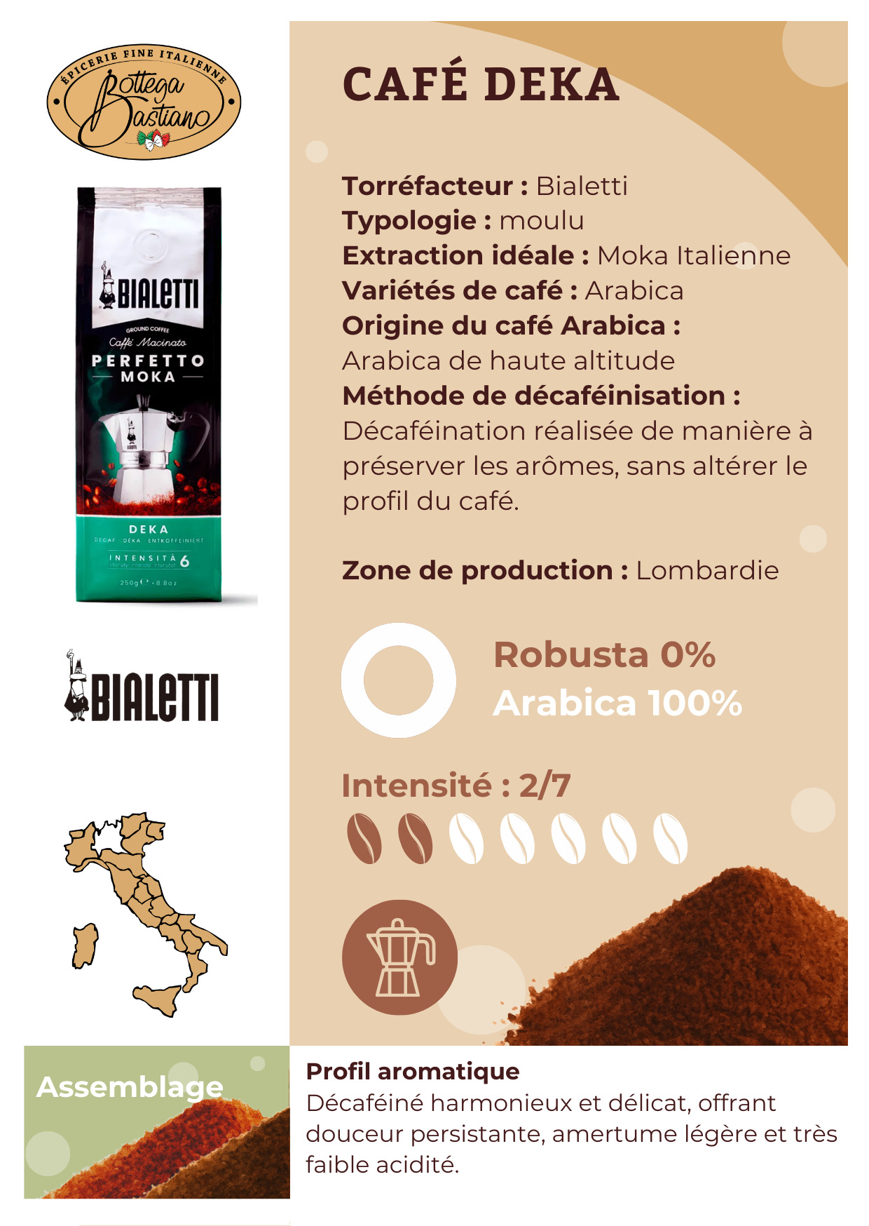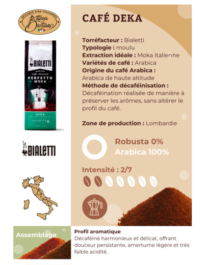 Le Café Moulu Deka Bialetti est bien plus qu'un simple café : il incarne la tradition italienne de la torréfaction, le choix des meilleures matières premières, et un mélange parfait pour une expérience partagée autour d’un moka savoureux. Prenez le temps d’apprécier chaque gorgée et laissez-vous emporter par un moment convivial et chaleureux.