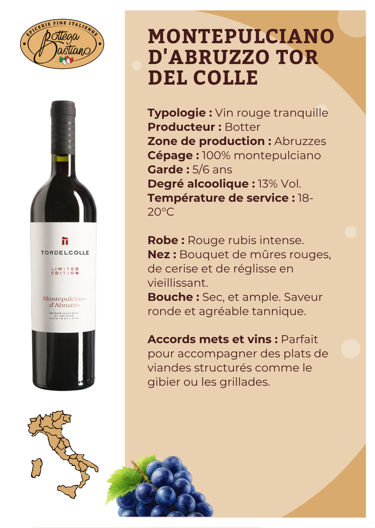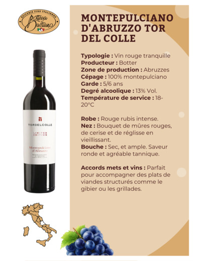 Le Montepulciano d'Abruzzo est un vin rouge italien AOC des Abruzzes. Tiré de ce cépage autochtone typique de cette belle région du sud de l'Italie, il est affiné 12 mois en fût de chêne avant d'être embouteillé, ce qui affine ses tannins et lui donne un juste niveau de complexité.
