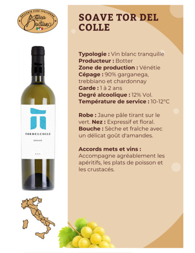 Soave DOC est un vin blanc tranquille qui est parfait à l'apéritif, avec des poissons, des crustacés