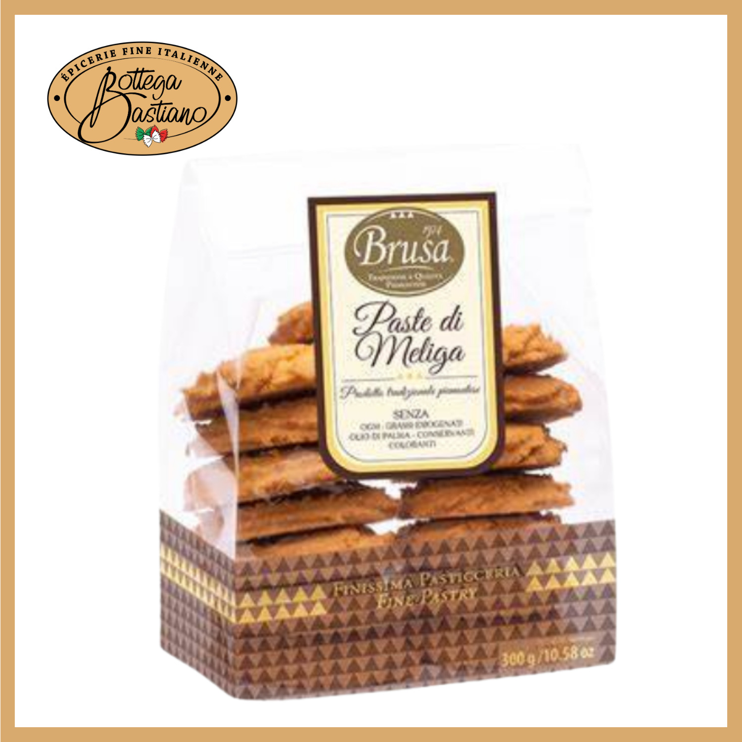 Les Paste di Meliga de la maison Brusa sont des biscuits traditionnels du Piémont, élaborés selon une recette artisanale mettant en valeur des ingrédients simples et authentiques. Ces biscuits se distinguent par leur texture friable et leur goût délicat, résultat d'un mélange harmonieux de farines de blé et de maïs.