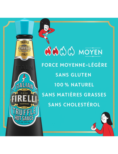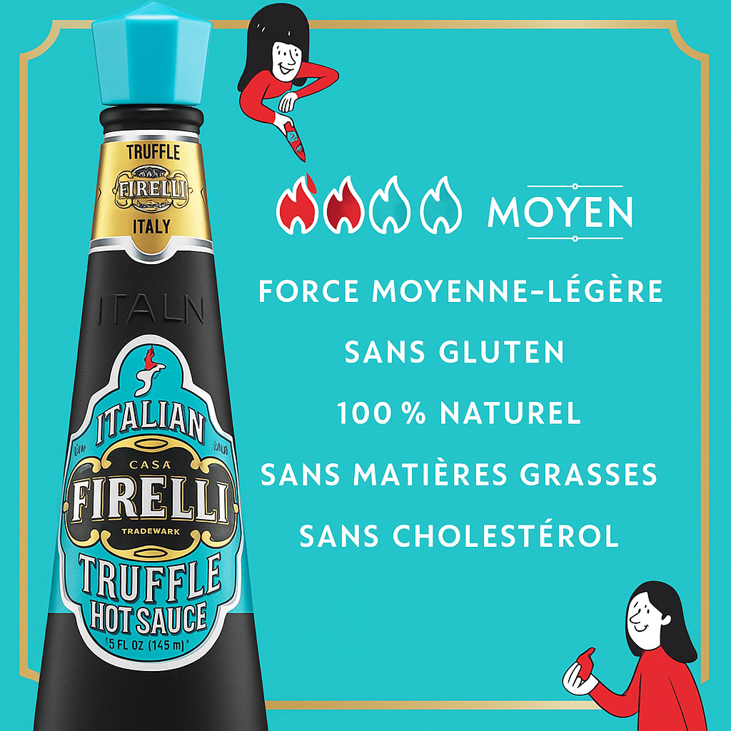 Firelli Truffes est une sauce piquante conçue avec des ingrédients italiens emblématiques. Elle est sans gluten, végétalienne, pauvre en sodium, compatible avec les régimes céto, paléo et à faible teneur en glucides.