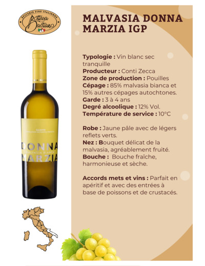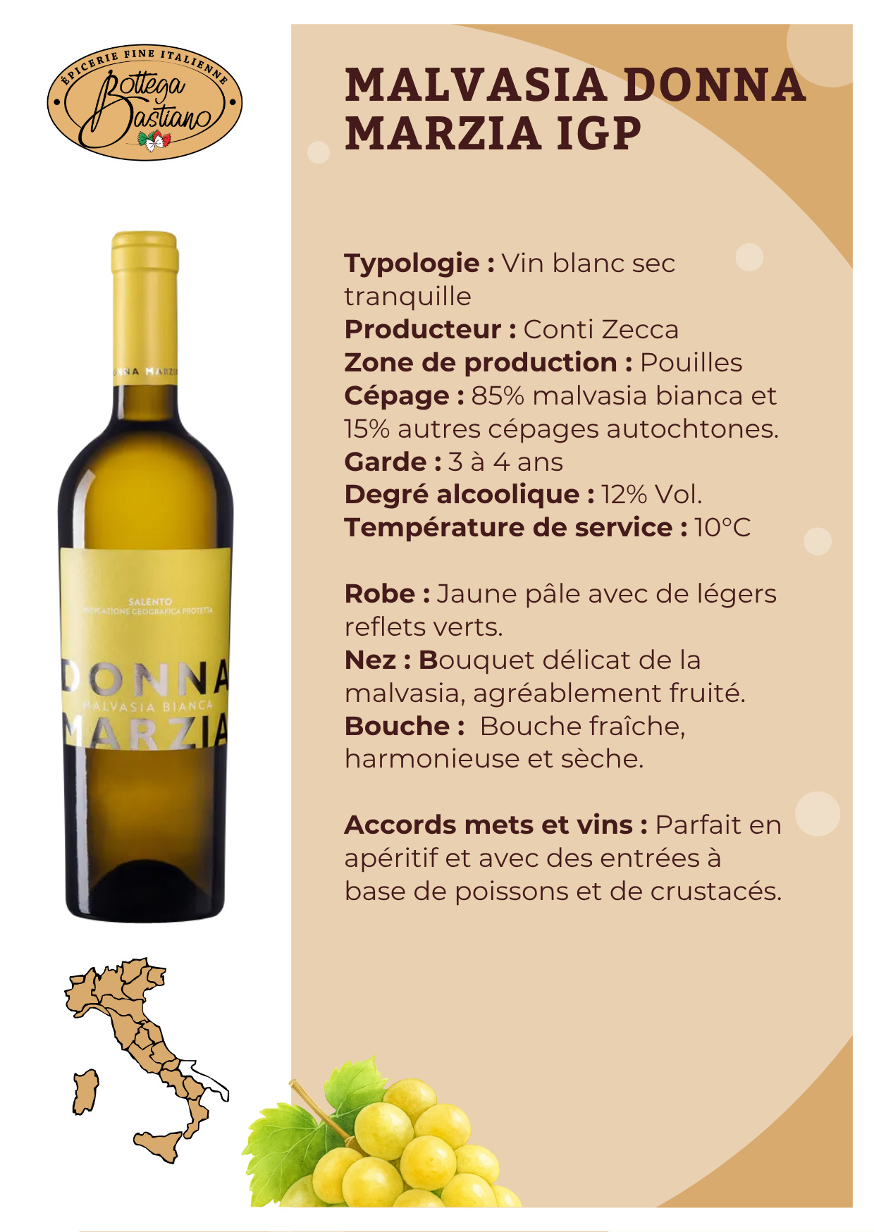 Le Donna Marzia blanc, très joli vin de la maison Conti Zecca est réalisé sur un monocépage autochtone malvasia bianca. Naturellement très expressif, ce cépage trouve dans le sud des Pouilles, à Leverano, un terroir propice à son expression.