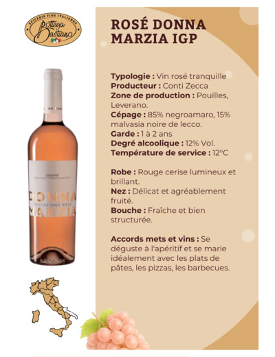 Donna Marzia est un vin rosé italien des Pouilles, propriété de la famille Conti Zecca, vieille dynastie d'origine napolitaine à la barre de ce beau domaine de Leverano depuis plus de cinq siècles. Ce vin rosé aromatique, gourmand et bien équilibré est élaboré à partir de cépages autochtones, dont 85% de negroamaro et 10% de malvasia nera di Lecce.