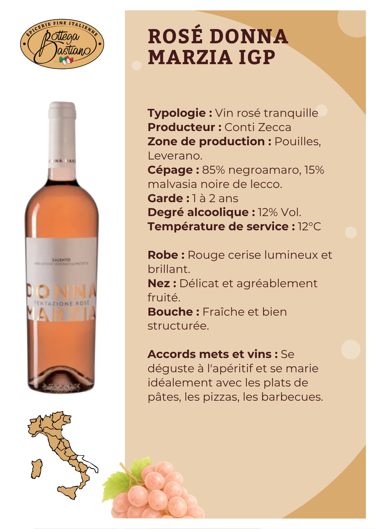 Les Conseils de Bottega Bastiano: Compagnon idéal d'antipasti, d'une pasta ou d'un risotto maison à base de fruits de mer, ou d'une grillade de viande blanche.