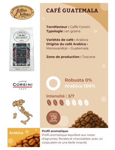 Guatemala, grains de café 100% Arabica avec des notes d’agrumes et de chocolat.