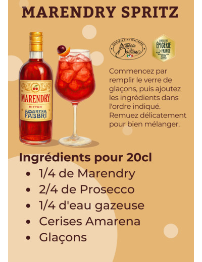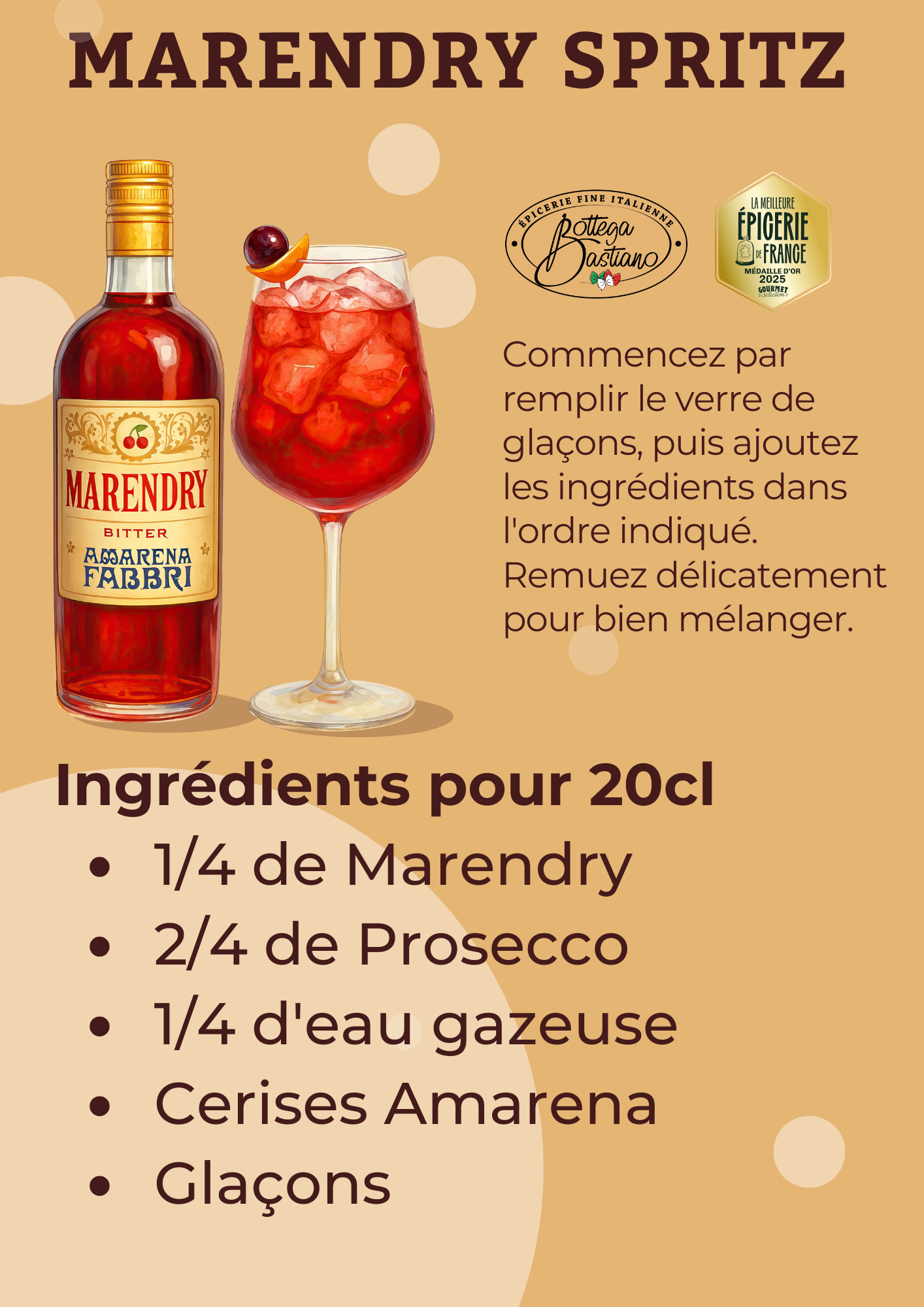 Le Marendry Bitter est fabriqué par l'enseigne Fabbri. C'est une liqueur italienne qui a une faible teneur d'alcool à 21%. Le Marendry a un côté amer. Il est très apprécié pour réaliser des cocktails connus comme le Spritz.