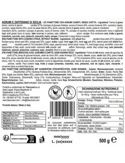 Préparé avec un levain naturel et des ingrédients soigneusement sélectionnés — farine de blé tendre, œufs frais et précieux safran sicilien, il offre une pâte moelleuse au parfum unique.