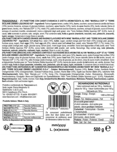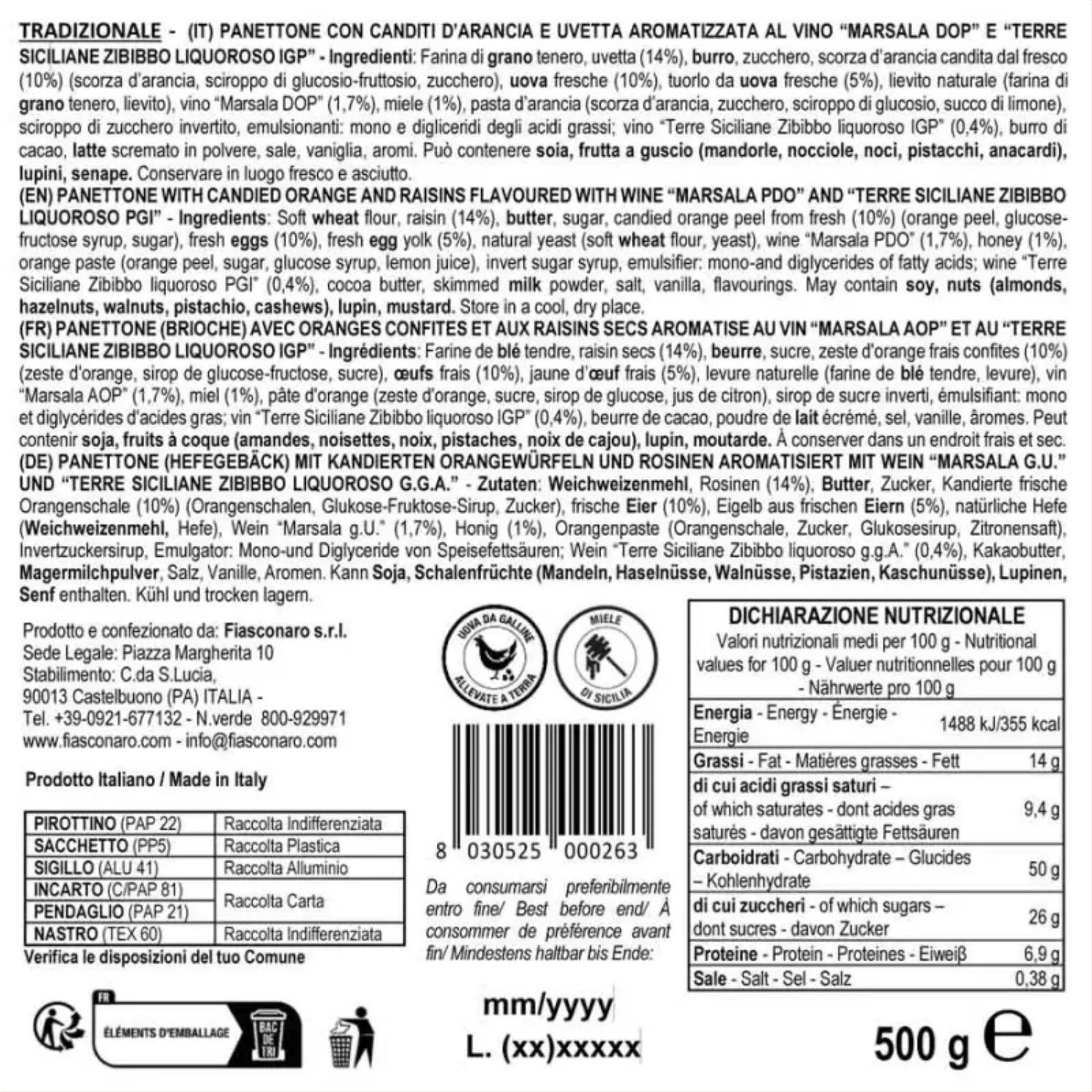 Le Panettone Traditionnel Fiasconaro de 500 g avec fruits confits est une douceur artisanale produite à Castelbuono, au cœur de la Sicile, et emballée entièrement à la main. Dans cette version plus petite que celle de 1 kg, le panettone est enveloppé dans un emballage élégant, fermé par un ruban qui rehausse la valeur de l'emballage, ce qui en fait un cadeau idéal et raffiné. La recette est celle du Panettone classique du nord de l'Italie, réinterprétée selon une clé sicilienne : sans glaçage, mais riche en fruits confits parfumés à l'orange et en raisins secs, aromatisés au vin Marsala DOP et à la liqueur Zibibbo Terre Siciliane IGP. Une excellence de la confiserie sicilienne, à déguster ou à offrir non seulement pendant les fêtes, mais aussi à tout moment de l'année.