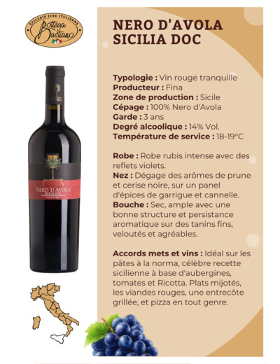 Depuis des siècles, le nero d'avola est à la base des vins de la D.O.C. Sicile, situé dans cet archipel au sud de la péninsule italienne. Sur cette île, connue dans l'Antiquité sous le nom de Sicania ou Trinacria (en raison de sa forme triangulaire), les Phéniciens et les Grecs cultivaient déjà les meilleures variétés et produisaient du vin.