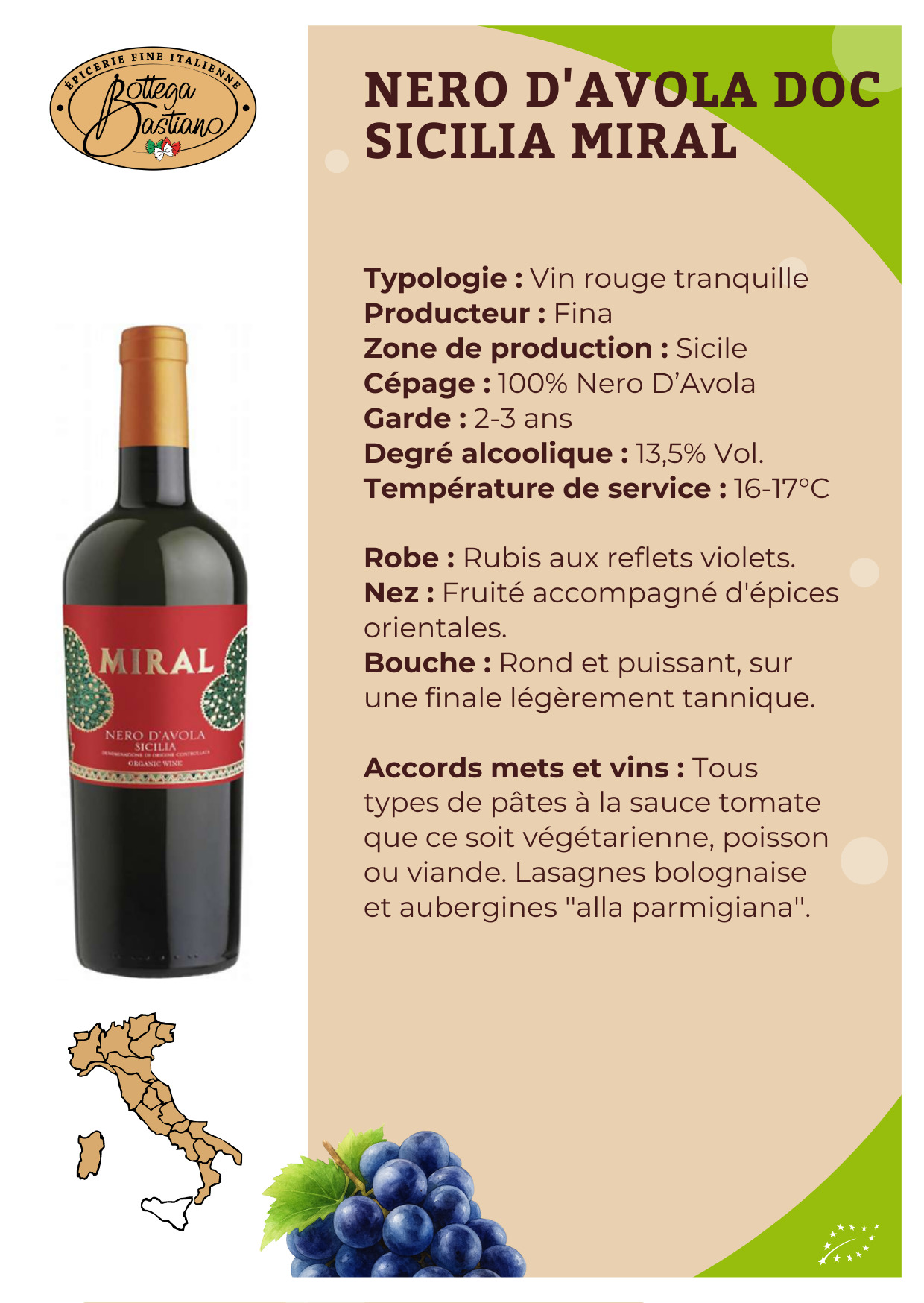 Un vin chaleureux, facile à apprécier, qui apporte toute l’âme et l’intensité de la Sicile à table.