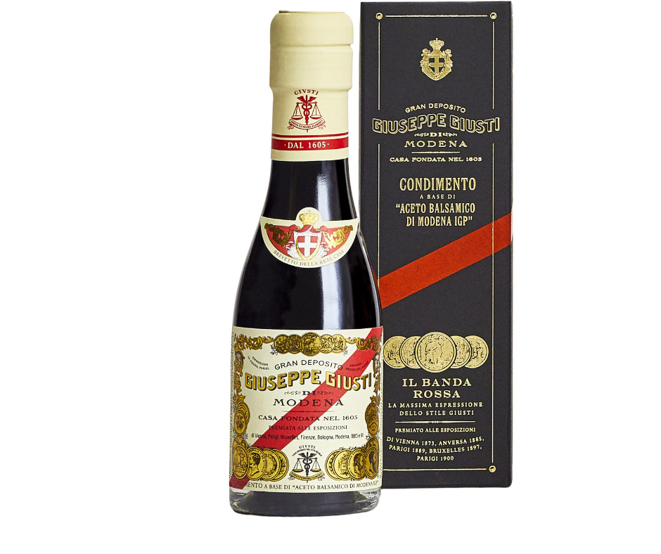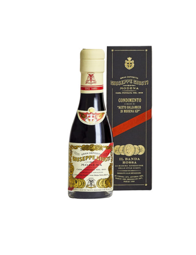 La plus grande fierté de la maison Giusti, ce Vinaigre balsamique de Modène IGP 5 Médailles d'Or "Bande Rouge" représentait le cadeau personnel de l'oncle Giuseppe aux membres actuels de la famille Giusti. D'une grande densité et d'épaisseur, sa richesse aromatique est incomparable. Il y a des notes de prunes, de cerises noires et un doux piquant infusé par les bois anciens, datant de 1700-1800, dans lesquels il est resté, qui persistent longtemps après la dégustation.
