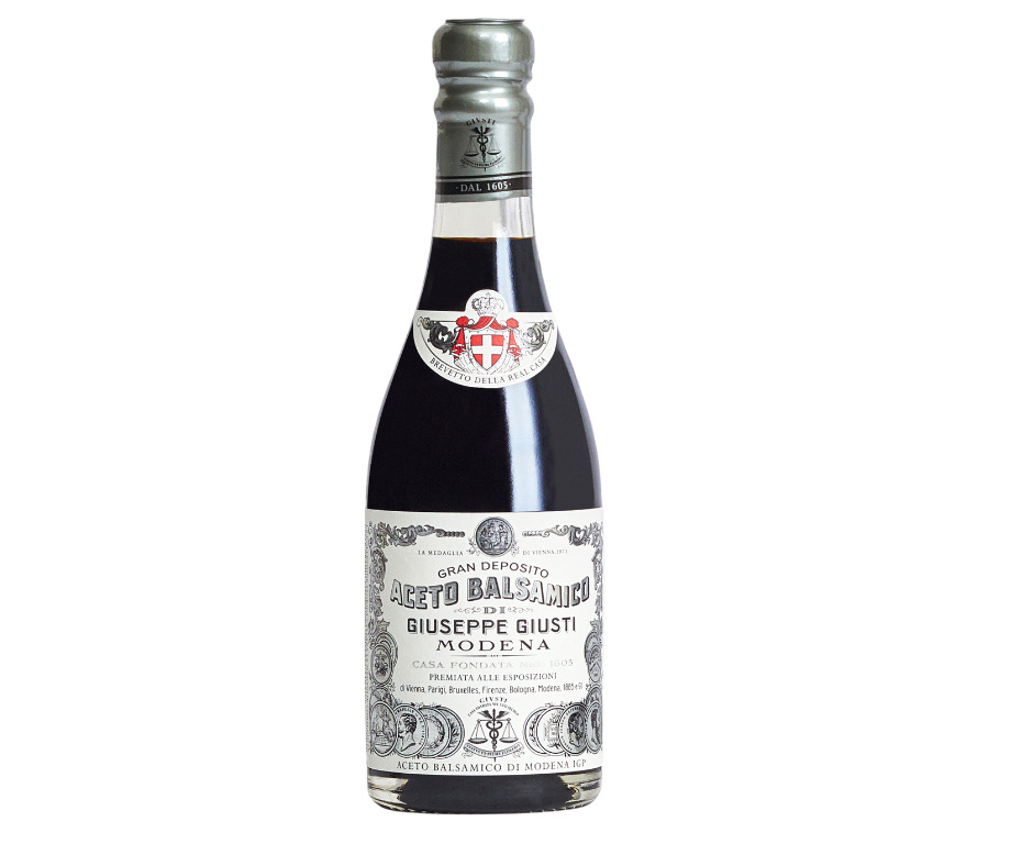 Le Vinaigre Balsamique de Modène IGP 1 Médaille d'argent Giuseppe Giusti est caractérisée par un arôme riche et une bonne et acidité balsamique. Issu du pressurage léger des raisins Trebbiano, on obtient un jus particulièrement sucré. Ceci est ensuite mélangé avec des vinaigres de vin blanc de haute qualité et vieilli dans des fûts de chêne français et de frêne.