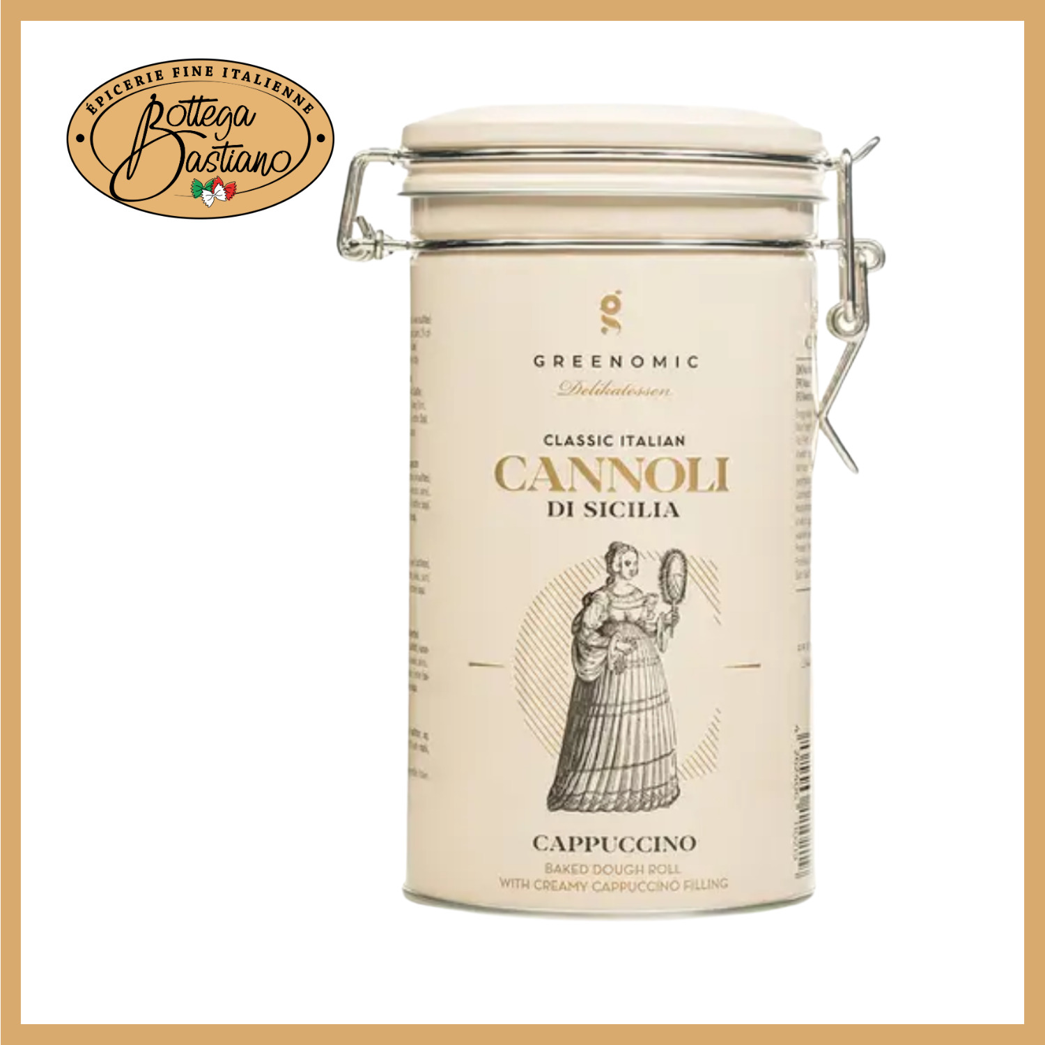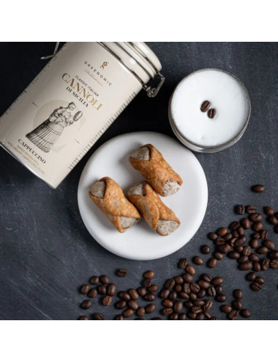 L'icône de la pâtisserie sicilienne. De délicieux cannoli fourrés à la crème de cappuccino dans une charmante boîte zippée.