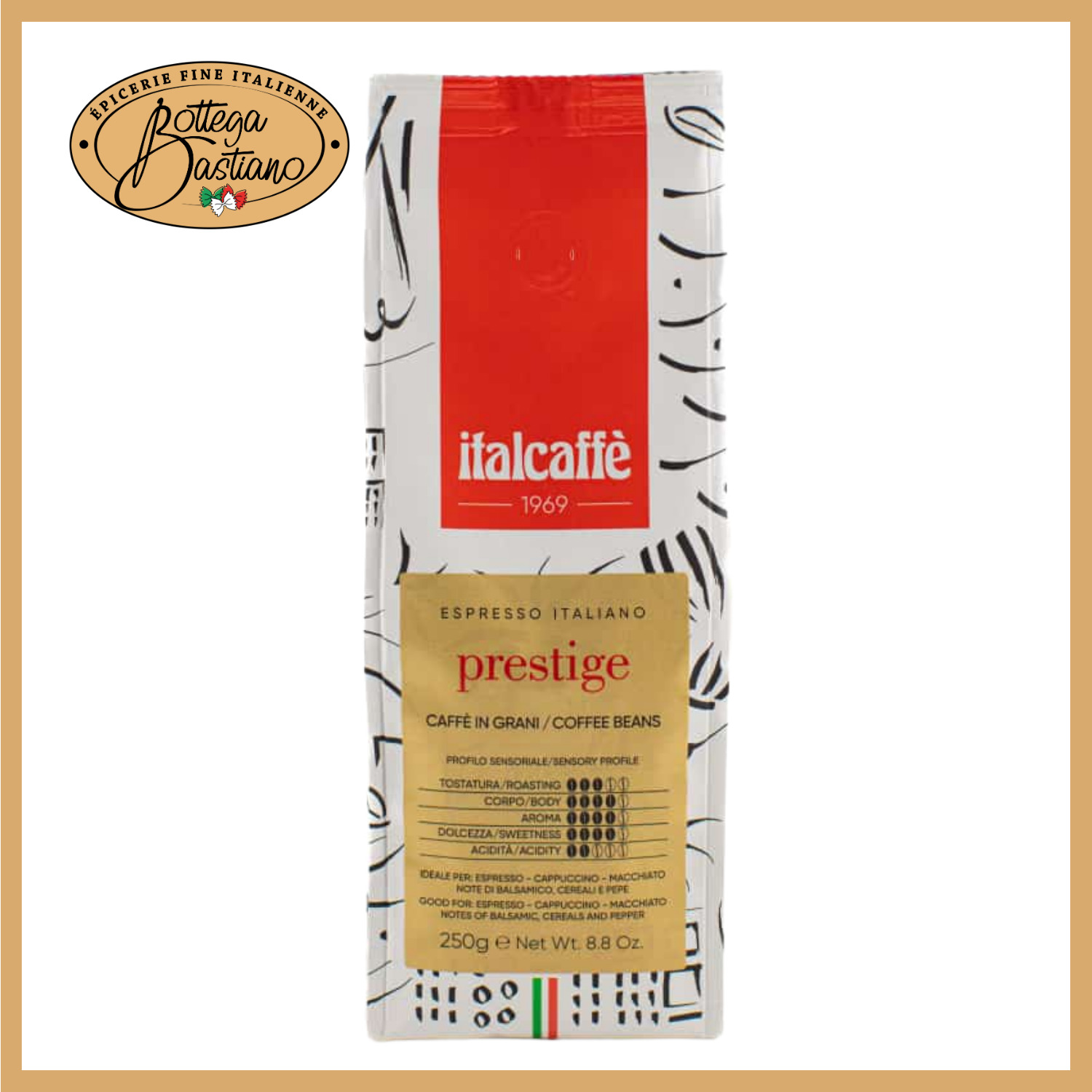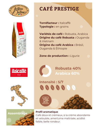 Savourez un espresso unique avec notre mélange de café grains 40% Robusta et 60% Arabica. Provenant directement d'Italie, ce café incarne le véritable goût traditionnel italien, vous offrant une expérience sensorielle inégalée à chaque tasse.