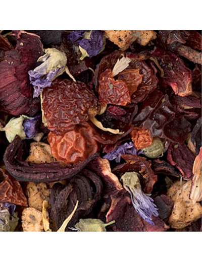 Hibiscus, Rose musquée 30%, Pomme, Arômes, Myrtilles 2,5%, Baies de sureau 2,5%, Arôme naturel, Soucis, Pétales de bleuet