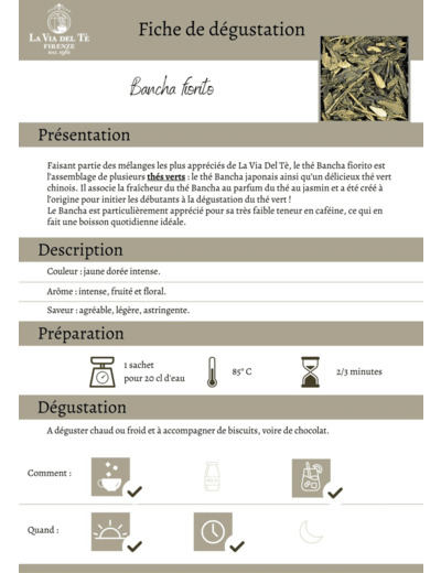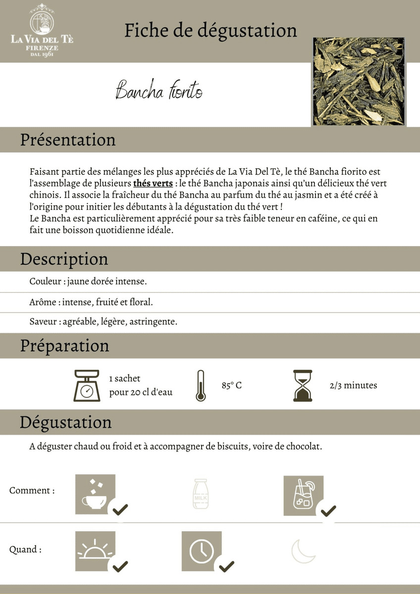 L'un des mélanges les plus appréciés de La Via del Tè, un mélange de thés verts qui associe la fraîcheur du thé Bancha au parfum du thé au jasmin. Il s'agit d'une boisson vive, à la couleur claire et lumineuse, au goût fleuri et persistant caractéristique et aux notes fruitées.