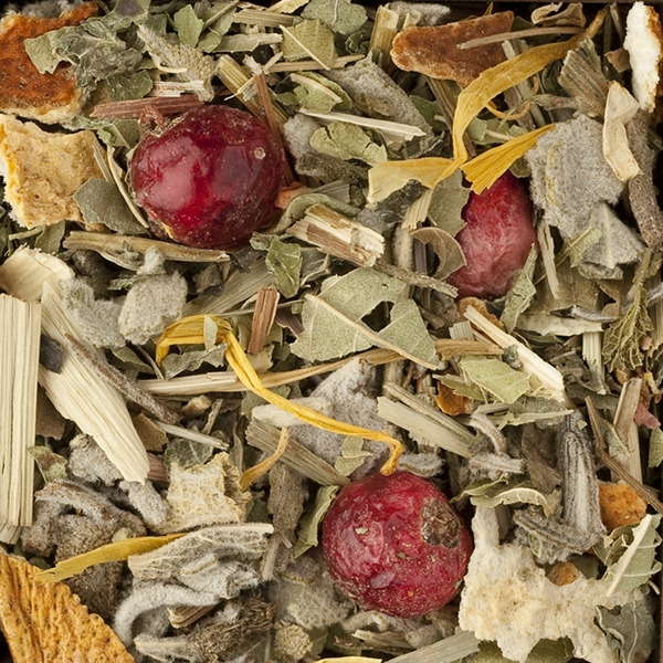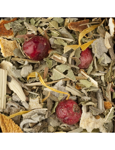 Mélisse, feuilles de verveine, feuilles de sauge, citronnelle, zeste de citron, groseille, pétales de souci, arôme naturel
