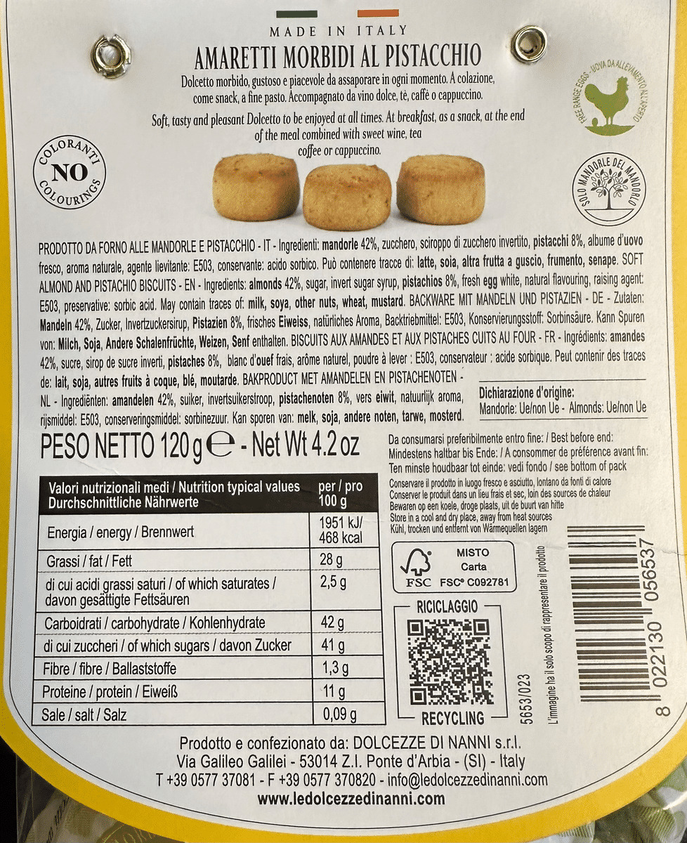 Dans un élégant emballage unidose, paquet de 120 g, 6 pièces par sachet. Macarons mous, bonbons à la pistache. Vous pouvez les trouver dans huit saveurs assorties, avec uniquement des arômes naturels : avec le parfum classique d'amande, d'orange, de citron, de chocolat, de cappuccino, de pistache, Café et caramel salé.