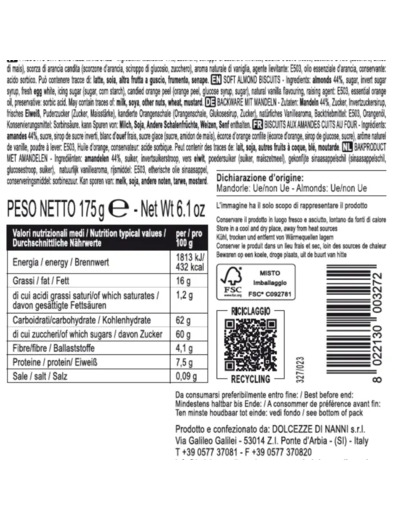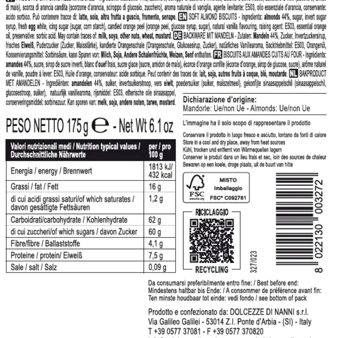 Gâteau aux amandes au cœur compact et léger, avec 40 % d'amandes, de sucre, de blanc d'œuf et un soupçon d'orange, naturellement sans gluten. Typique de la tradition de la confiserie de la ville de Sienne, il est entièrement fait à la main comme l'a transmis notre grand-mère. Excellent consommé en fin de repas, en dessert accompagné de vins doux ou combiné avec du thé, du café ou du cappuccino. Nous l'apprécions beaucoup en tant que gâteau de Noël.