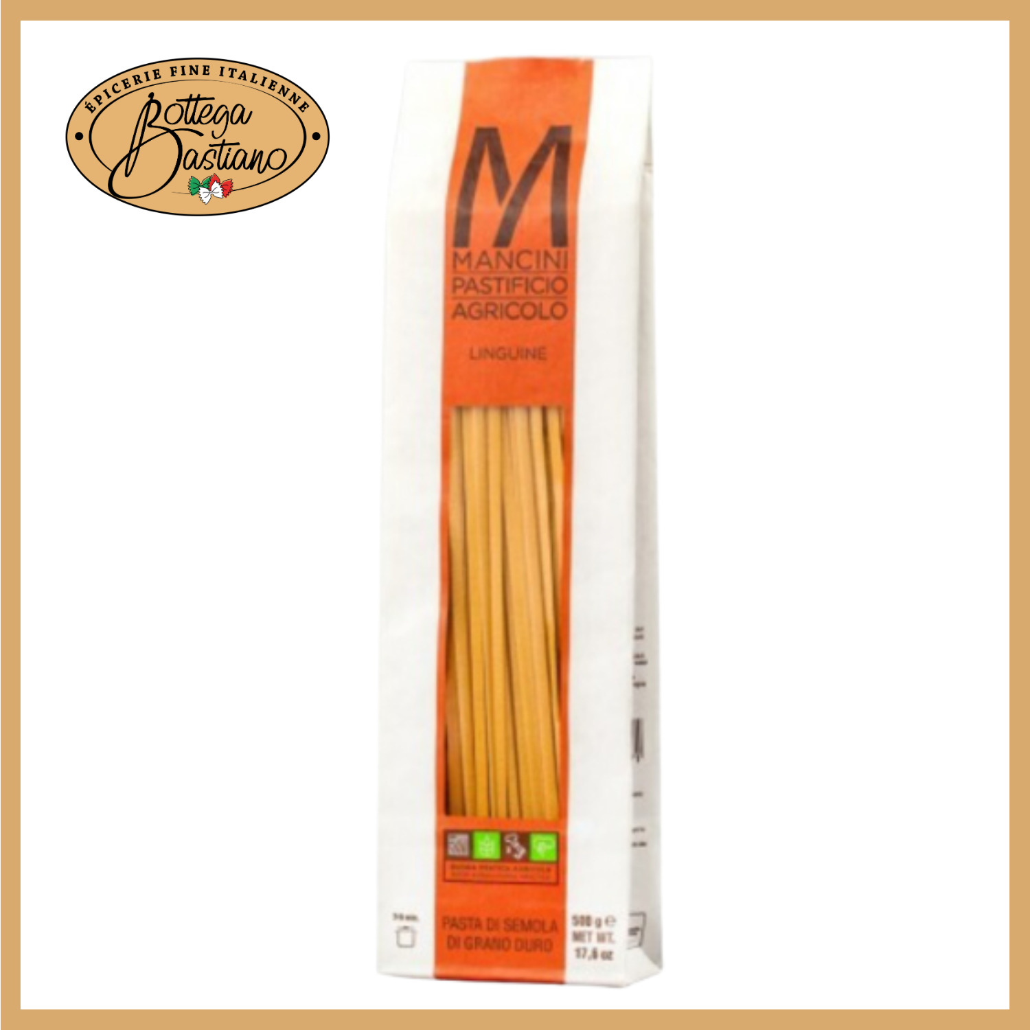 Les linguine sont parfaites pour accompagner des sauces onctueuses et sont le plus souvent associées aux fruits de mer (linguine alle vongole) et aux sauces à base de tomate. Pastificio Mancini cultive lui-même son blé et produit les pâtes artisanalement. Il prête une attention tout particulière à la terre tant pour veiller à sa préservation que pour obtenir une qualité de pâte exceptionnelle.