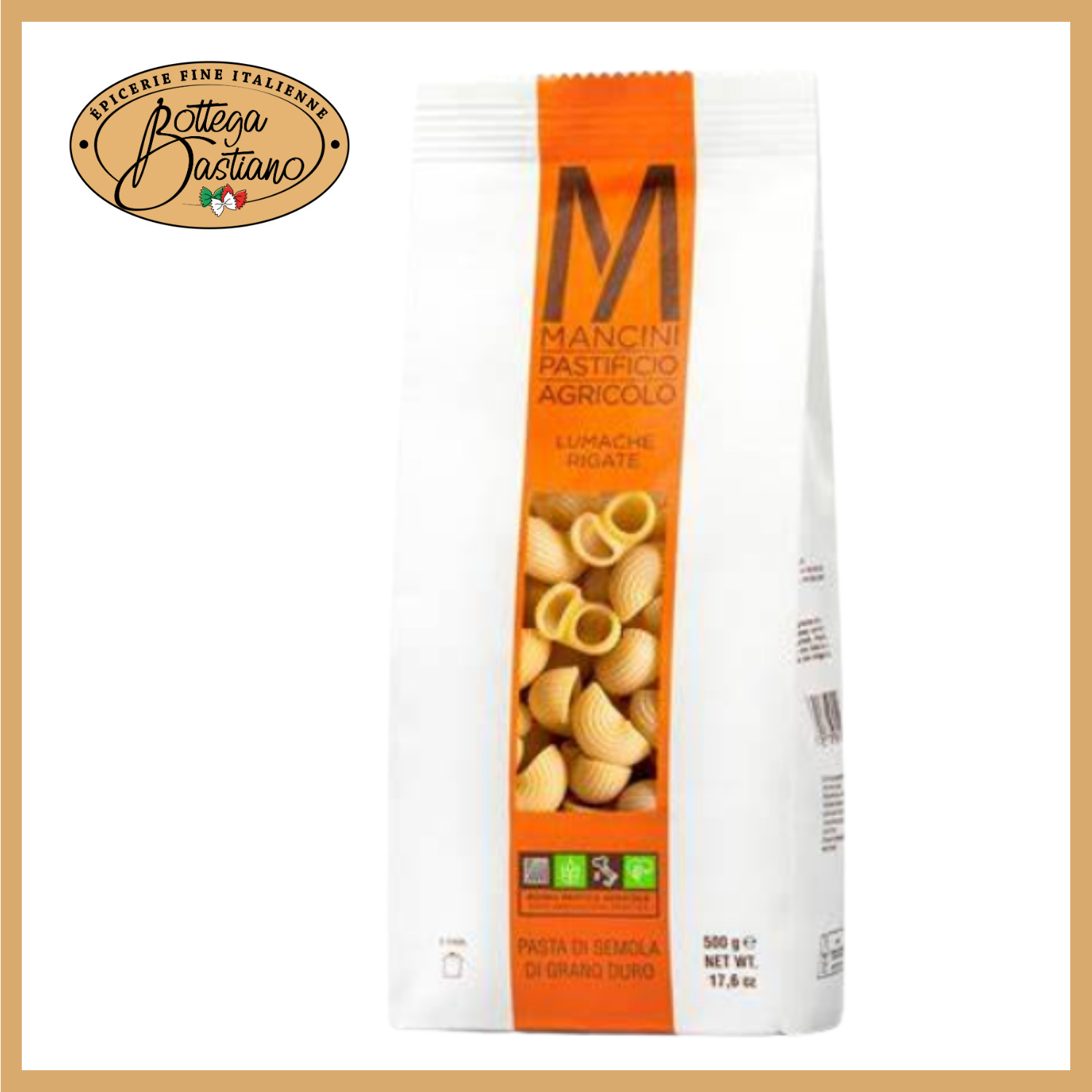Les Lumache Rigate sont la nouveauté de Pasta Mancini, un format de pâtes unique en forme de petits escargots rainurés, parfait pour capturer les sauces. Fabriquées artisanalement à partir de blé dur cultivé et récolté dans les champs de la région des Marches, ces pâtes offrent une texture et une saveur incomparables. Idéales pour accompagner des sauces riches comme les ragù de viande ou les préparations à base de légumes, elles se prêtent également parfaitement aux plats gratinés au four. Laissez-vous séduire par l'authenticité et la qualité des pâtes Pasta Mancini.