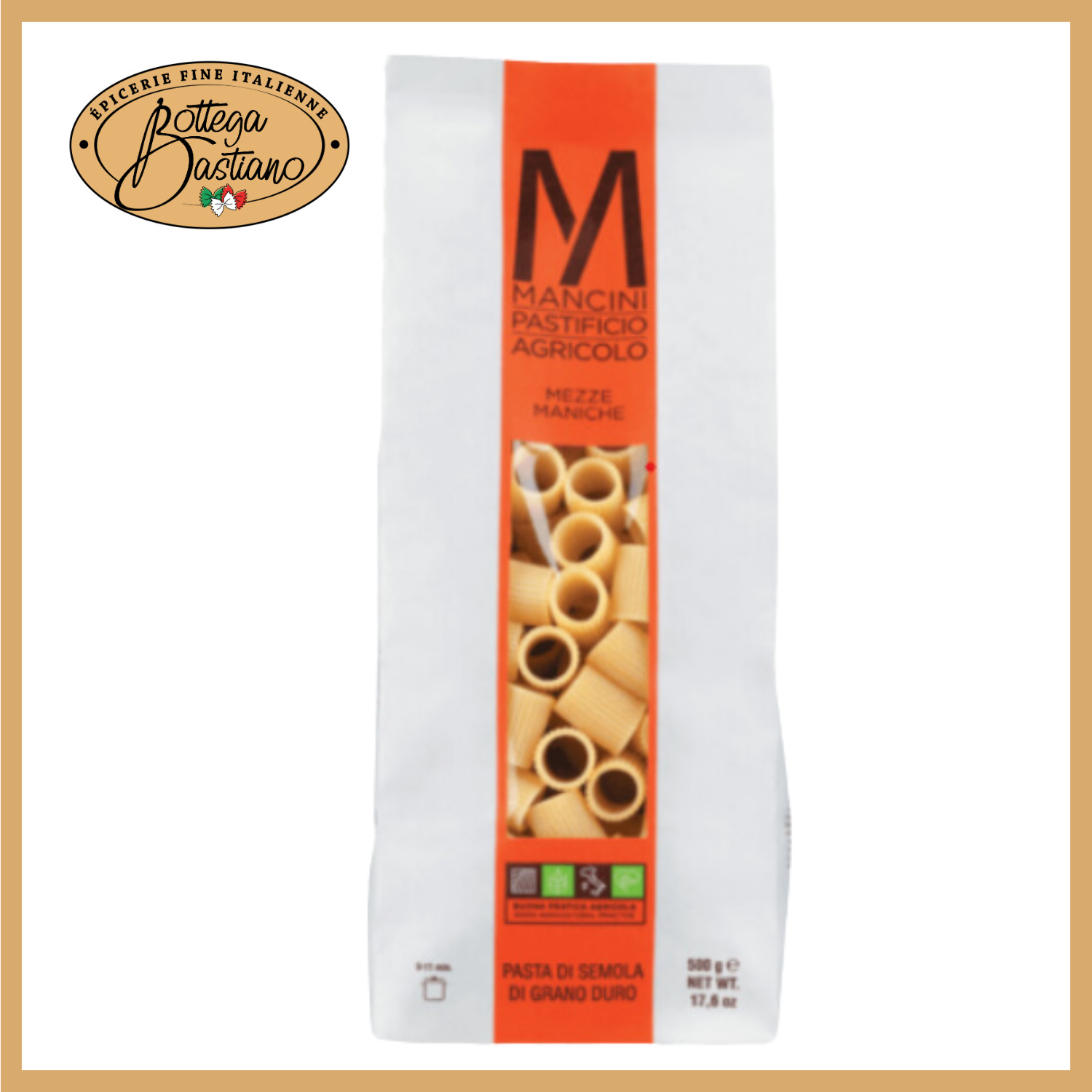 Les mezze maniche sont les pâtes passe-partout : à la sauce tomate, en ragoût ou en salade, il faut toujours avoir un paquet de mezze maniche dans sa cuisine ! Pastificio Mancini cultive lui-même son blé et produit les pâtes artisanalement. Il prête une attention tout particulière à la terre tant pour veiller à sa préservation que pour obtenir une qualité de pâte exceptionnelle.