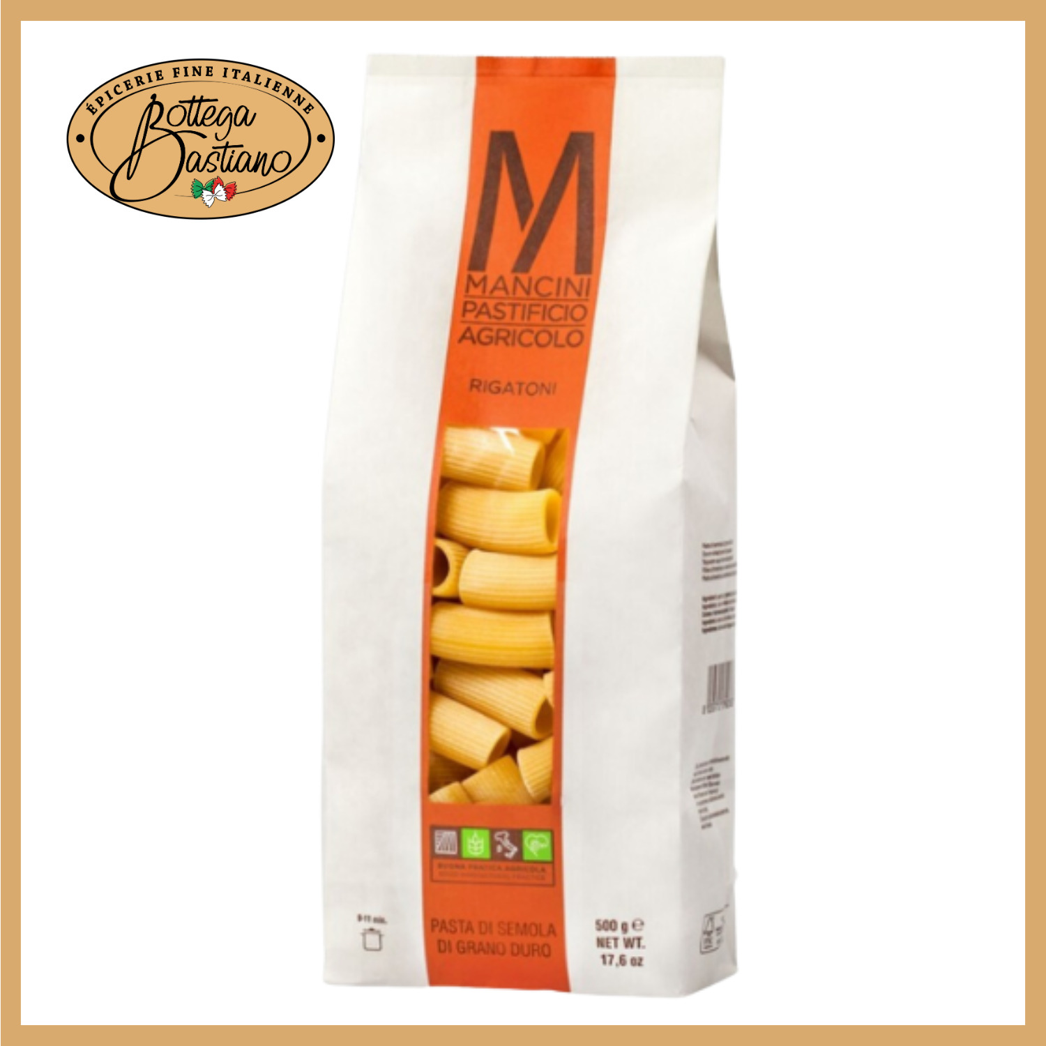 Les rigatoni se dégustent avec des sauces à base de viande ou de poisson comme la carbonara (sauce typique de Rome). Pastificio Mancini cultive lui-même son blé et produit les pâtes artisanalement. Il prête une attention tout particulière à la terre tant pour veiller à sa préservation que pour obtenir une qualité de pâte exceptionnelle.