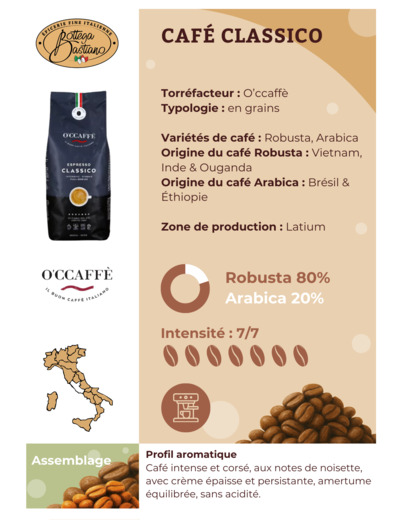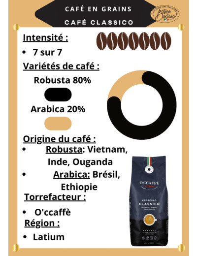 Ce mélange de café est composé à 80 % de rubusta et à 20 % d'arabica. Les grains de café Espresso Classico proviennent d'Inde, du Vietnam et du Brésil.