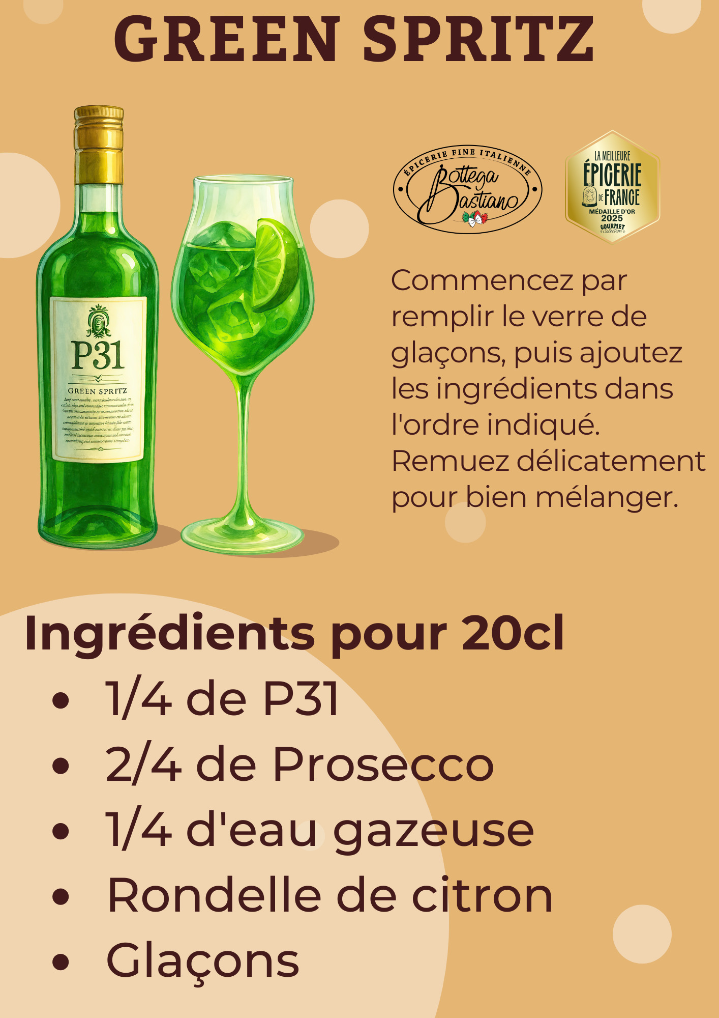 Le P31, appelé ainsi dû à son nombre d’ingrédients naturels, est né en 2015. Cet alcool mixe la fraîcheur, la nouveauté et la tradition. Deux ans de recherche lui ont été consacrés pour trouver LA recette. Ce mélange unique, aux 31 ingrédients, pourra accompagner vos fin de repas en tant que digestif, ou vos aperitivo dans le cocktail star : le GreenSpritz.
