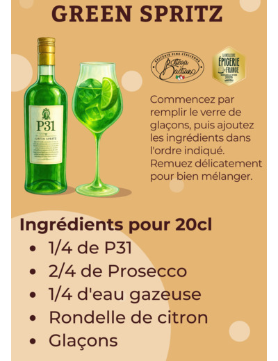 Le P31, appelé ainsi dû à son nombre d’ingrédients naturels, est né en 2015. Cet alcool mixe la fraîcheur, la nouveauté et la tradition. Deux ans de recherche lui ont été consacrés pour trouver LA recette. Ce mélange unique, aux 31 ingrédients, pourra accompagner vos fin de repas en tant que digestif, ou vos aperitivo dans le cocktail star : le GreenSpritz.