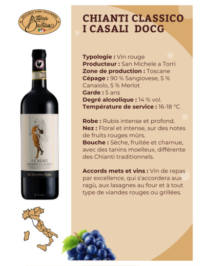 Le Chianti Classico "I Casali" de San Michele a Torri est un vin rouge toscan biologique, élaboré principalement à partir de Sangiovese. Il offre un nez intense de cerise et de violette, une bouche équilibrée avec des tanins fins et une belle fraîcheur. Parfait avec viandes grillées, plats italiens et fromages affinés.