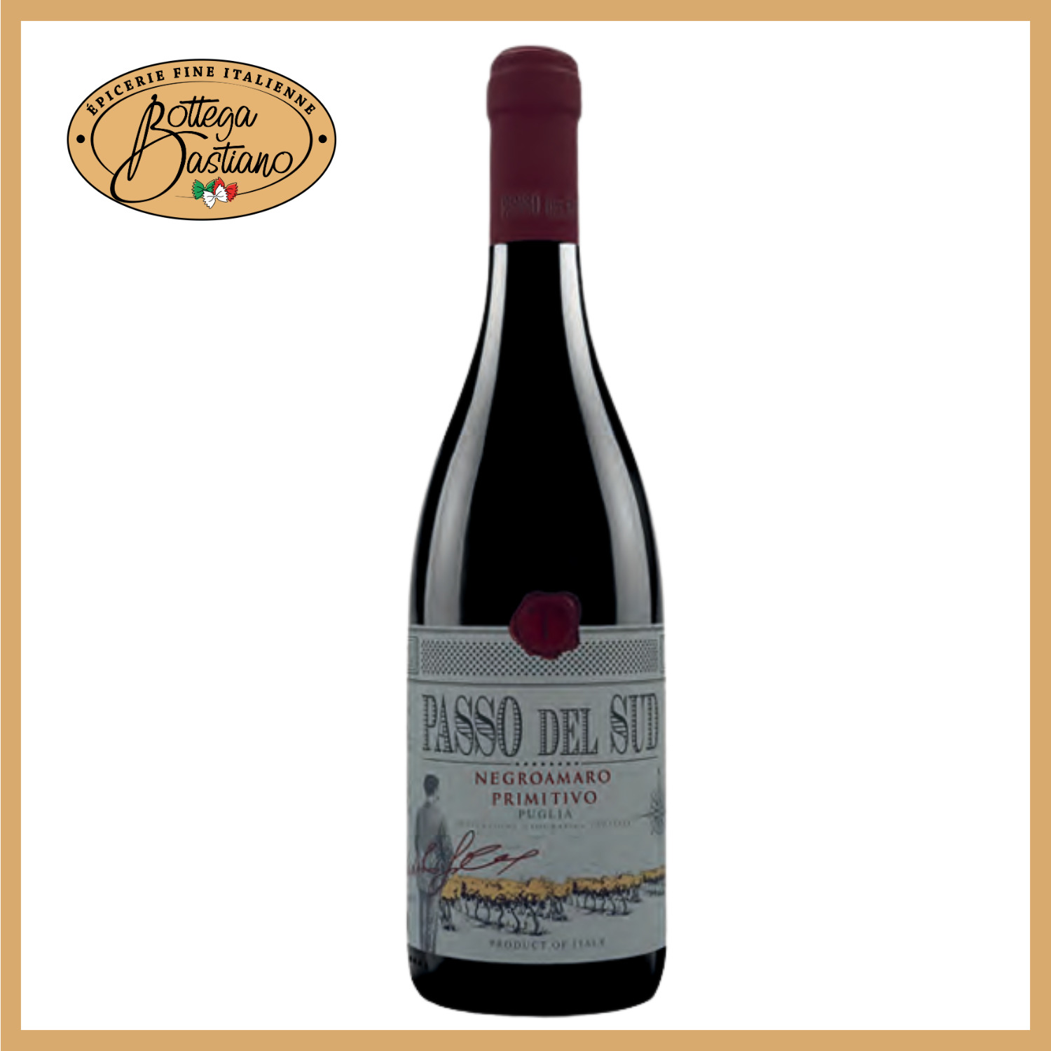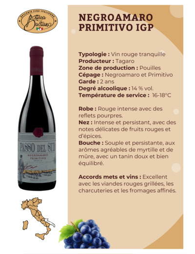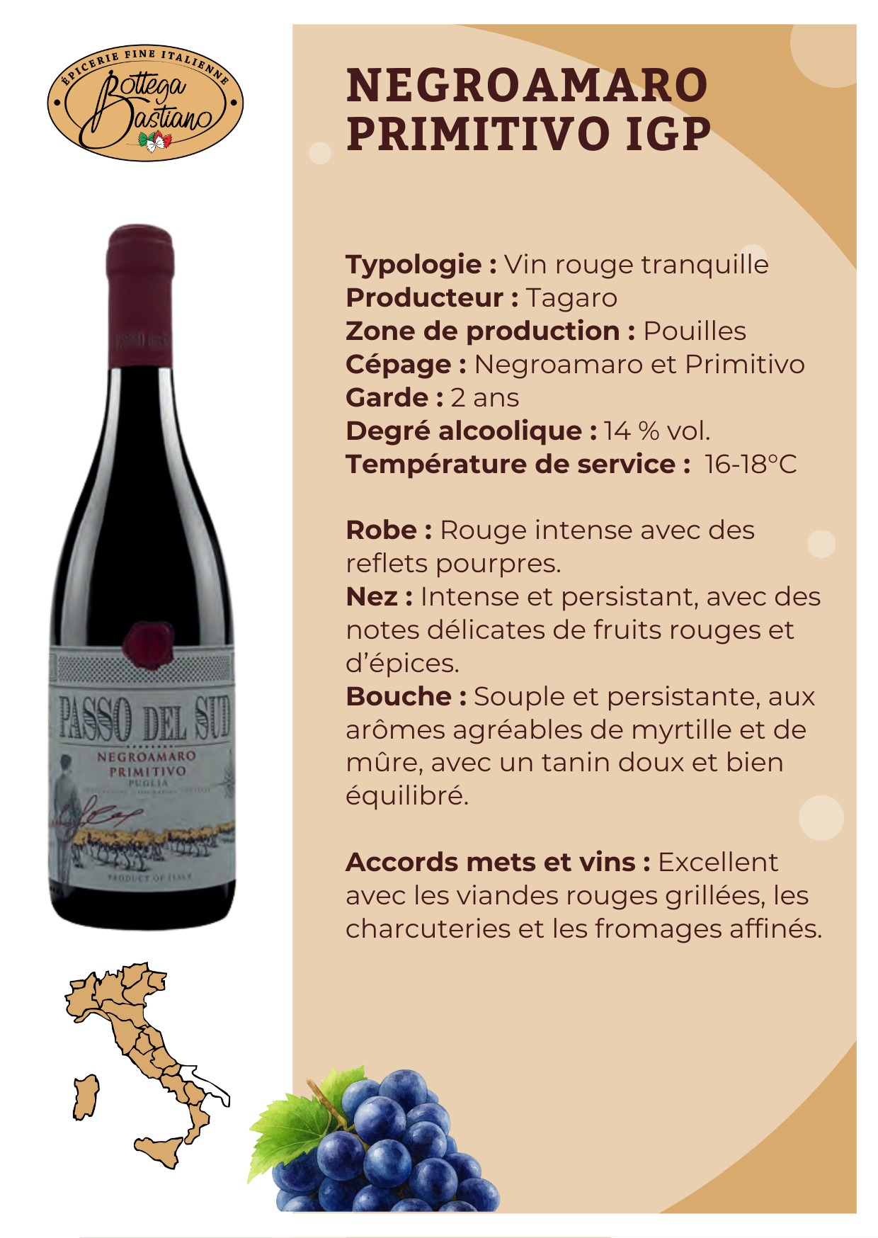 Un vin rouge du Sud de l’Italie, intense, gourmand et typique des Pouilles. L’alliance du Negroamaro et du Primitivo offre une cuvée chaleureuse, aromatique et très agréable à déguster.