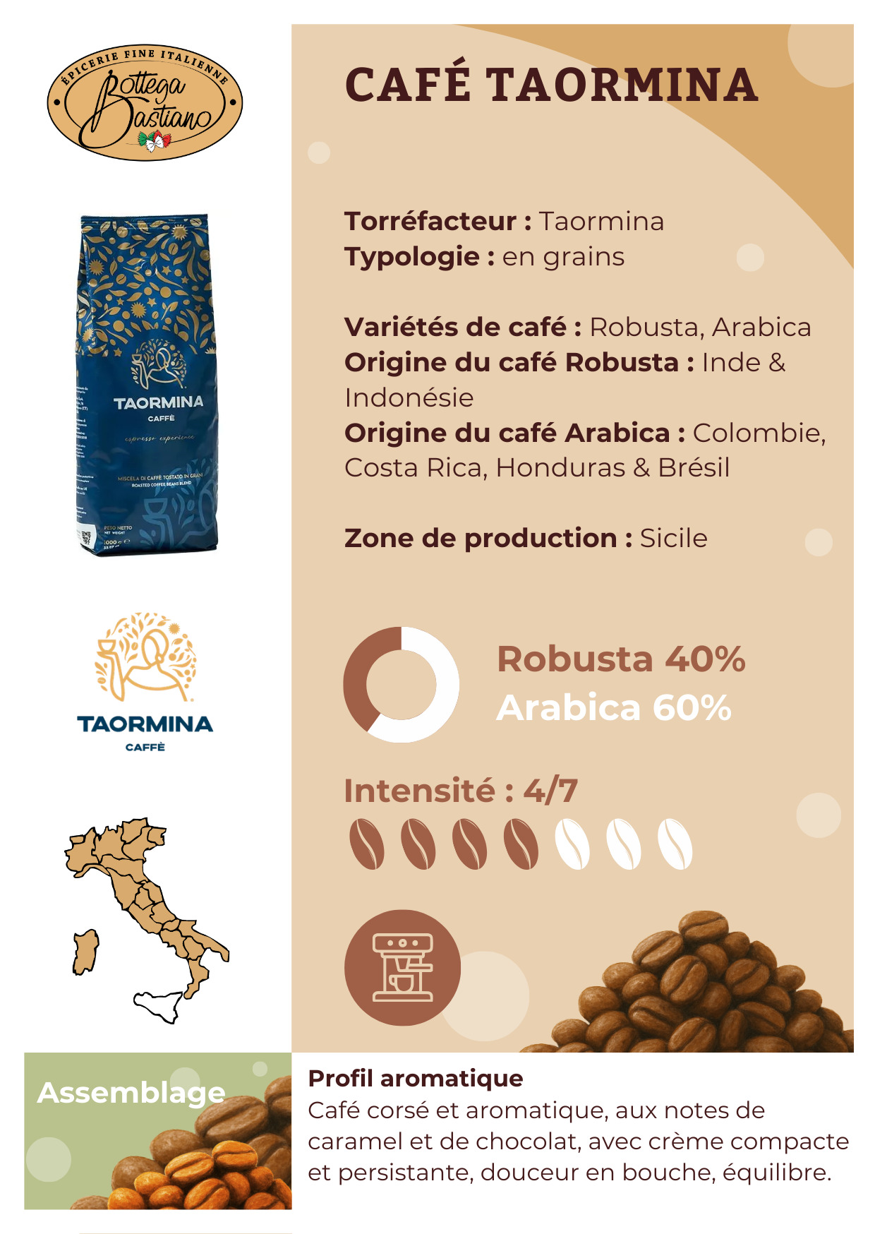 Avant même de prendre une première gorgée, laissez-vous séduire par le parfum envoûtant qui émane du Café Grains Taormina. Les notes de caramel se mêlent subtilement à des éclats de tabac et de chocolat, créant une invitation irrésistible à déguster ce café pur. Laissez-vous tenter sans sucre afin de profiter de la richesse de ses arômes.