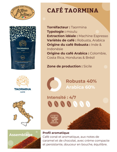 Avant même de prendre une première gorgée, laissez-vous séduire par le parfum envoûtant qui émane du Café Taormina. Les notes de caramel se mêlent subtilement à des éclats de tabac et de chocolat, créant une invitation irrésistible à déguster ce café pur. Laissez-vous tenter sans sucre afin de profiter de la richesse de ses arômes.