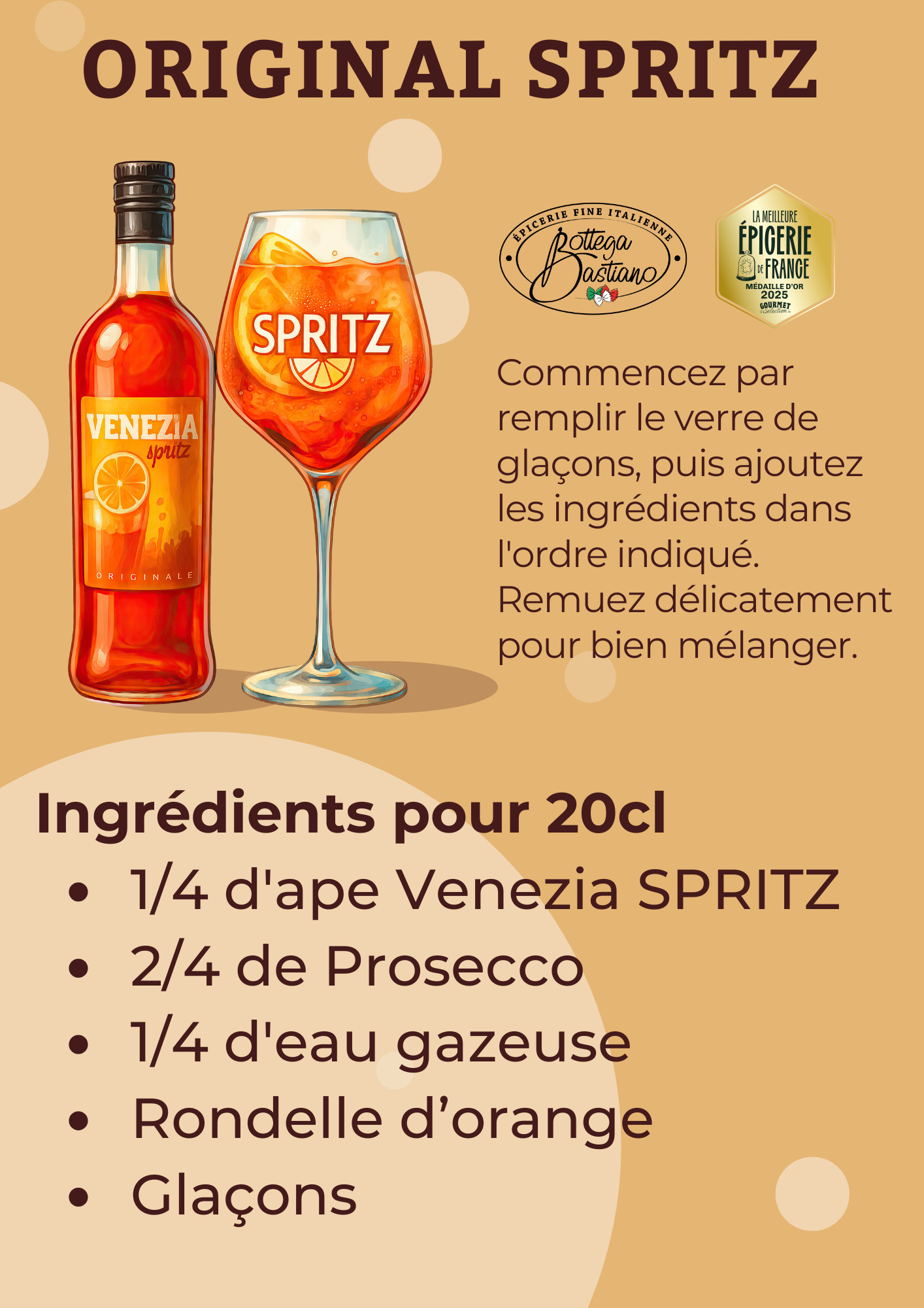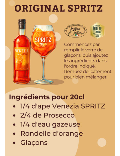 Le traditionnel spritz vénitien : 6 cl de prosecco (vin blanc pétillant italien), 4 cl d'Apé Venezia Spritz et un peu d'eau gazeuse, ajouter une rondelle d'orange et des glaçons. L'italian gipsy : frapper 4 cl d'Apé et 4 cl de jus d'orange, verser et compléter avec du champagne.