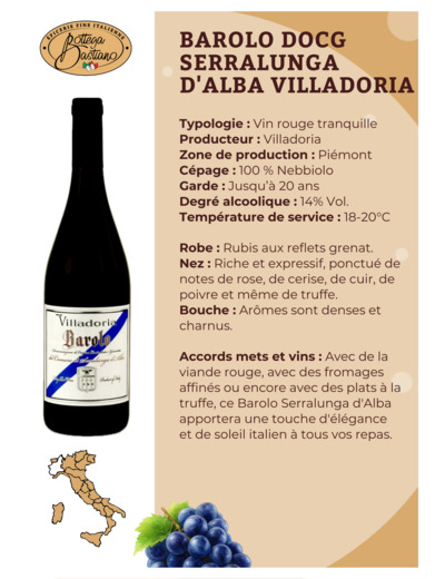 Découvrez un Barolo d'exception, 100% Nebbiolo, reconnu pour sa profondeur aromatique et son potentiel de garde remarquable. Élevé avec soin par la maison Villadoria, ce Barolo séduit les amateurs de grands vins italiens.