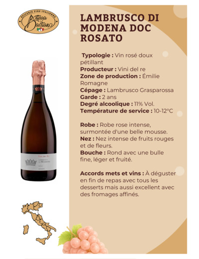 En somme, le Lambrusco Rosato Demi-Sec Vini del Re est un vin convivial et rafraîchissant, idéal pour les moments de détente et les repas entre amis, offrant une belle introduction aux vins effervescents italiens.