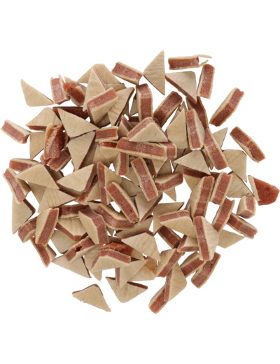 Composition : Poulet (40%), colin (9%), protéines végétales, farine de blé, glycerine, amidon, sorbitol, ail en poudre, huile végétale, sel.