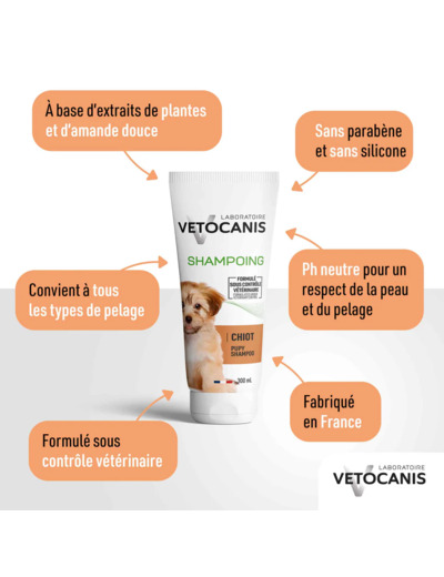 Le Shampoing pour Chiot VETOCANIS est formulé avec des extraits de plantes reconnus pour leur douceur, pour prendre soin de la peau sensible de votre petit animal.
