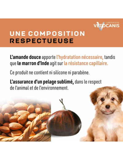 A l'extrait d'Amande Douce, sans parabène, ni silicone, le Shampoing VETOCANIS pour chiot respecte l'équilibre de sa peau, et sublime son pelage. Le shampoing rend le poil doux et brillant sans l'agresser.