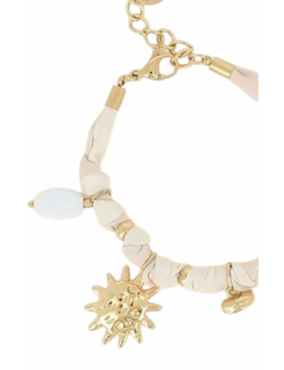 Bracelet composé d'un tissu aux motifs uniques, tressé avec une chaîne en acier inoxydable et embelli par des breloques .