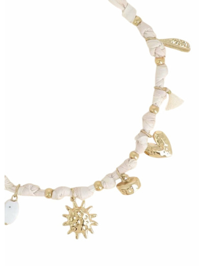 Collier composé d'un tissu aux motifs uniques, tressé avec une chaîne en acier inoxydable et embelli par des breloques .