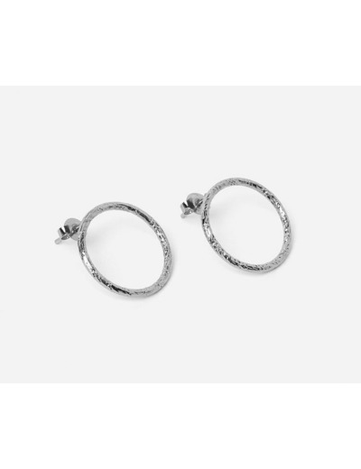 Rondes façon créoles plaquées à l'oreille en laiton argenté finement gravé.