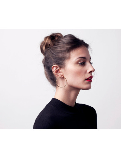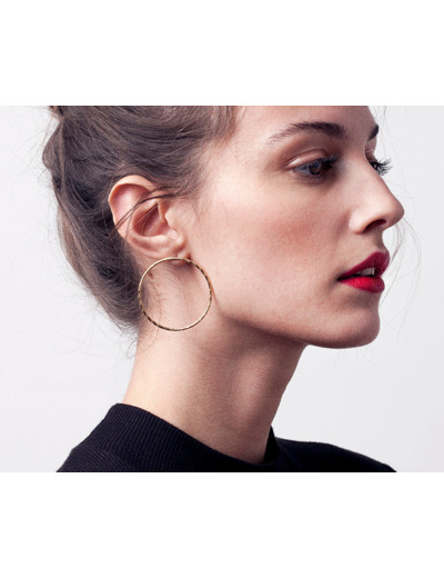 On adore la modernité des boucles Babette ici en grand modèle. Boucles d'oreilles au style minimaliste, rondes façon créoles plaquées à l'oreille en métal doré à l'or fin 24 carats et finement gravé.