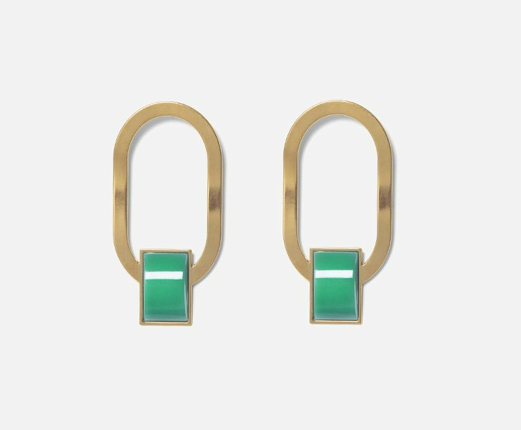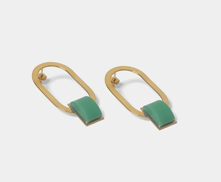 Grandes boucles d'oreilles ovales composées d'une forme géométrique dorée à l'or fin 24 carats et verre et rehaussée d'un cabochon en verre coloré.