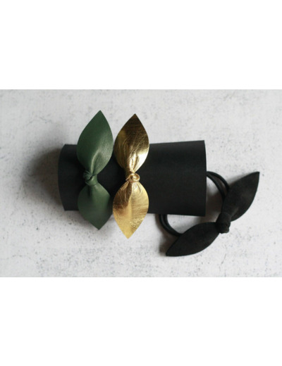Chouchou velours au toucher pour le noir, cuir pour le vert olive et effet métallisé pour le doré.