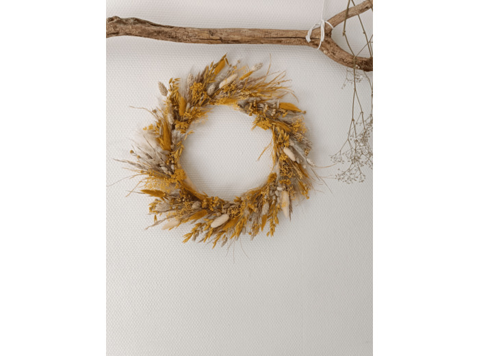 V'la le printemps ! Avec lui le retour du soleil qui réchauffe les cœurs. Cet anneau fleuri est composé à 100% de fleurs séchées de couleur jaune Moutarde comme l'Achillée, le Gypsophille, l'Avoine, l'Immortelle de Méditerranée, Lagures des Dunes et Pampa. Les fleurs recouvrent la totalité de l'anneau avec générosité.