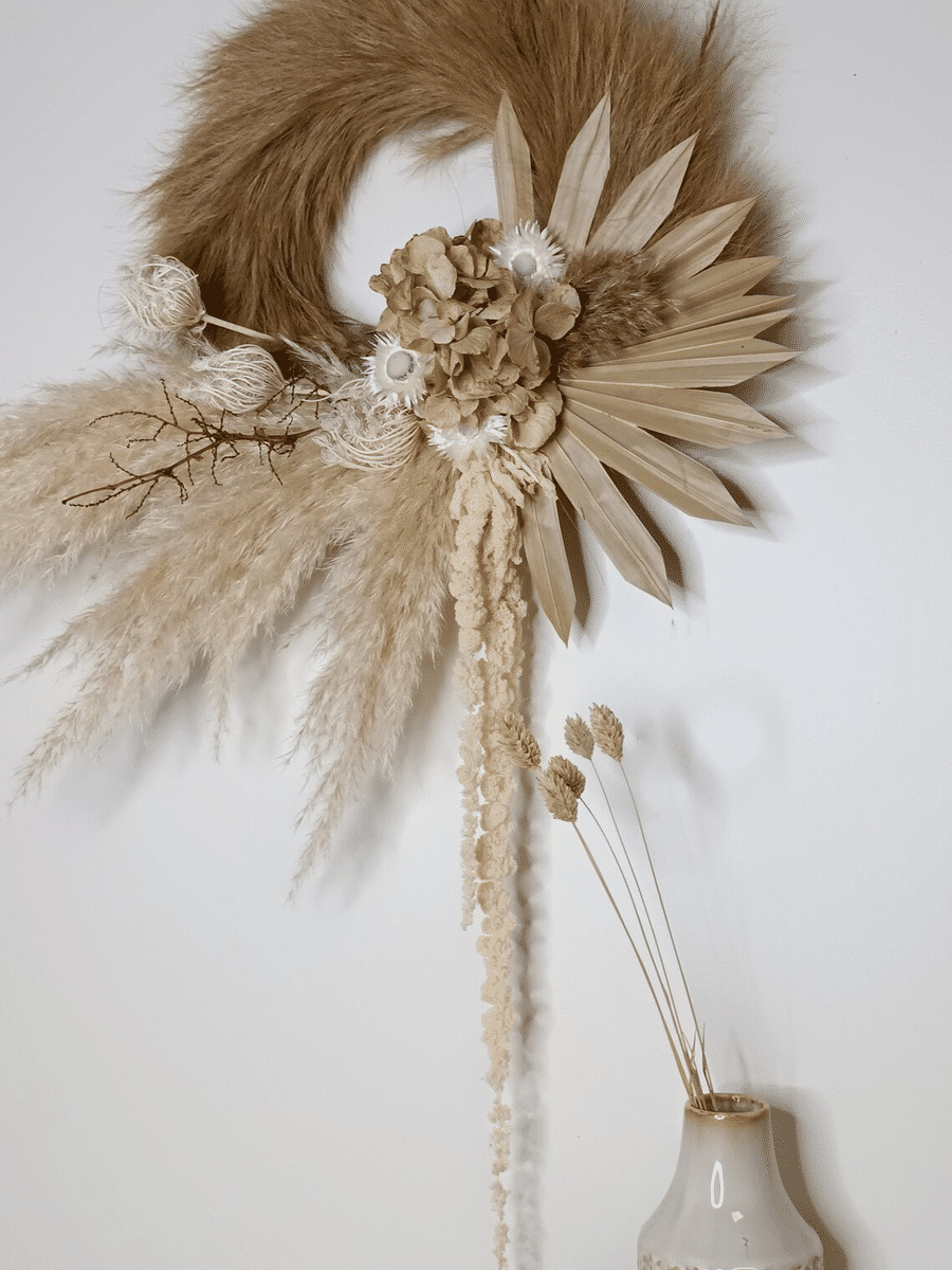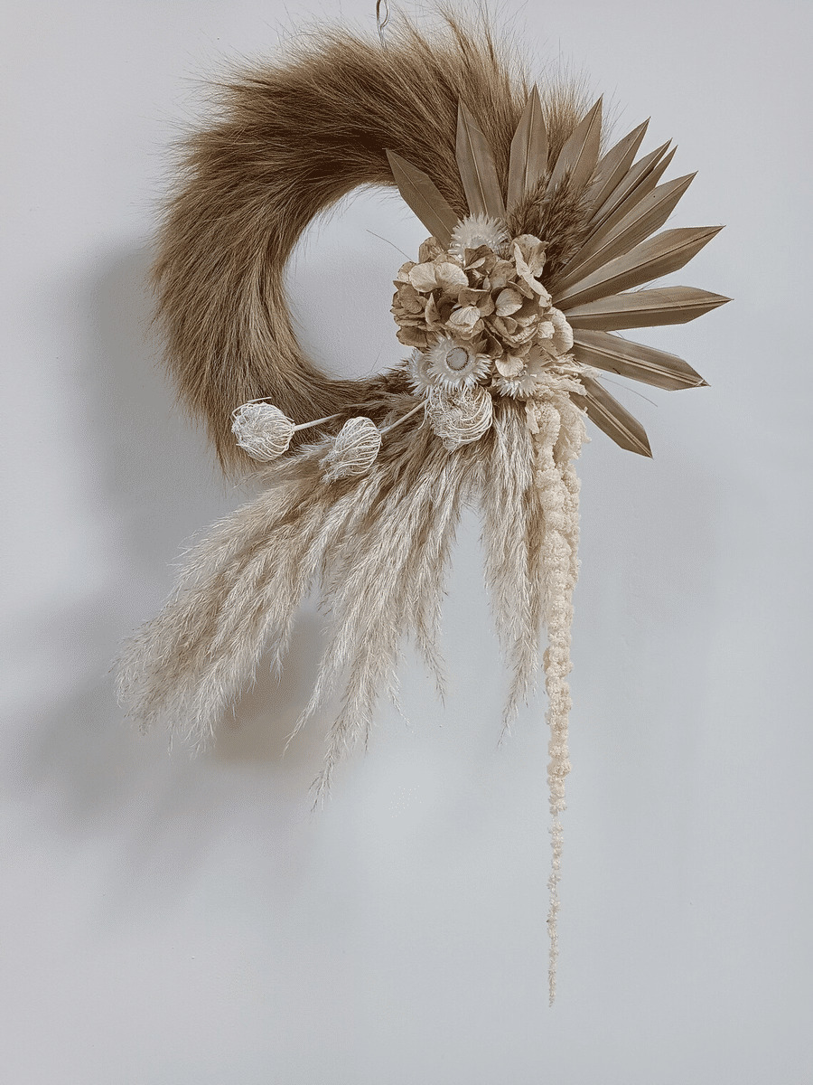 Décoration murale & artisanale en fleurs séchées et stabilisées dans une harmonie de blanc et Lin naturel .