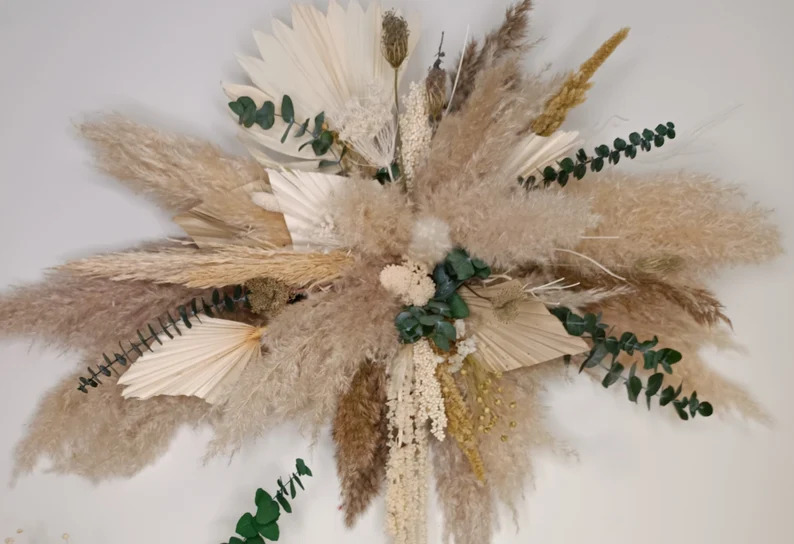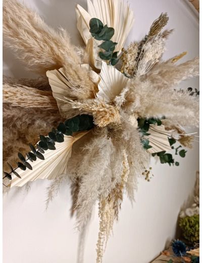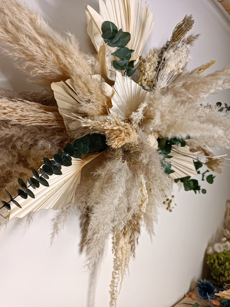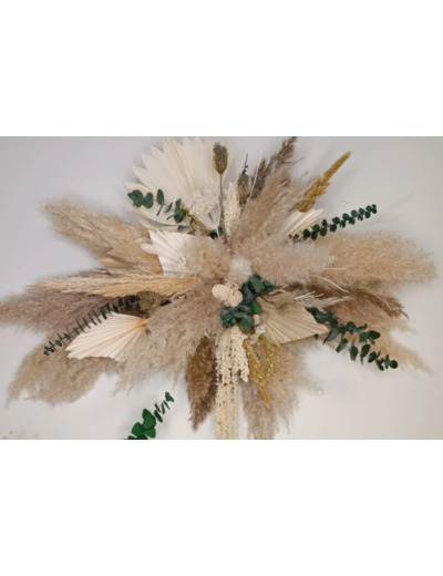 Succès assuré pour un décor de mariage Bohème Chic ! Cette confection d'herbe de Pampa et d'Eucalyptus à la fois sobre et apaisante apporte volupté et légèreté dans un espace professionnel comme une boutique de prêt à porter, un institut de beauté et de bien être.